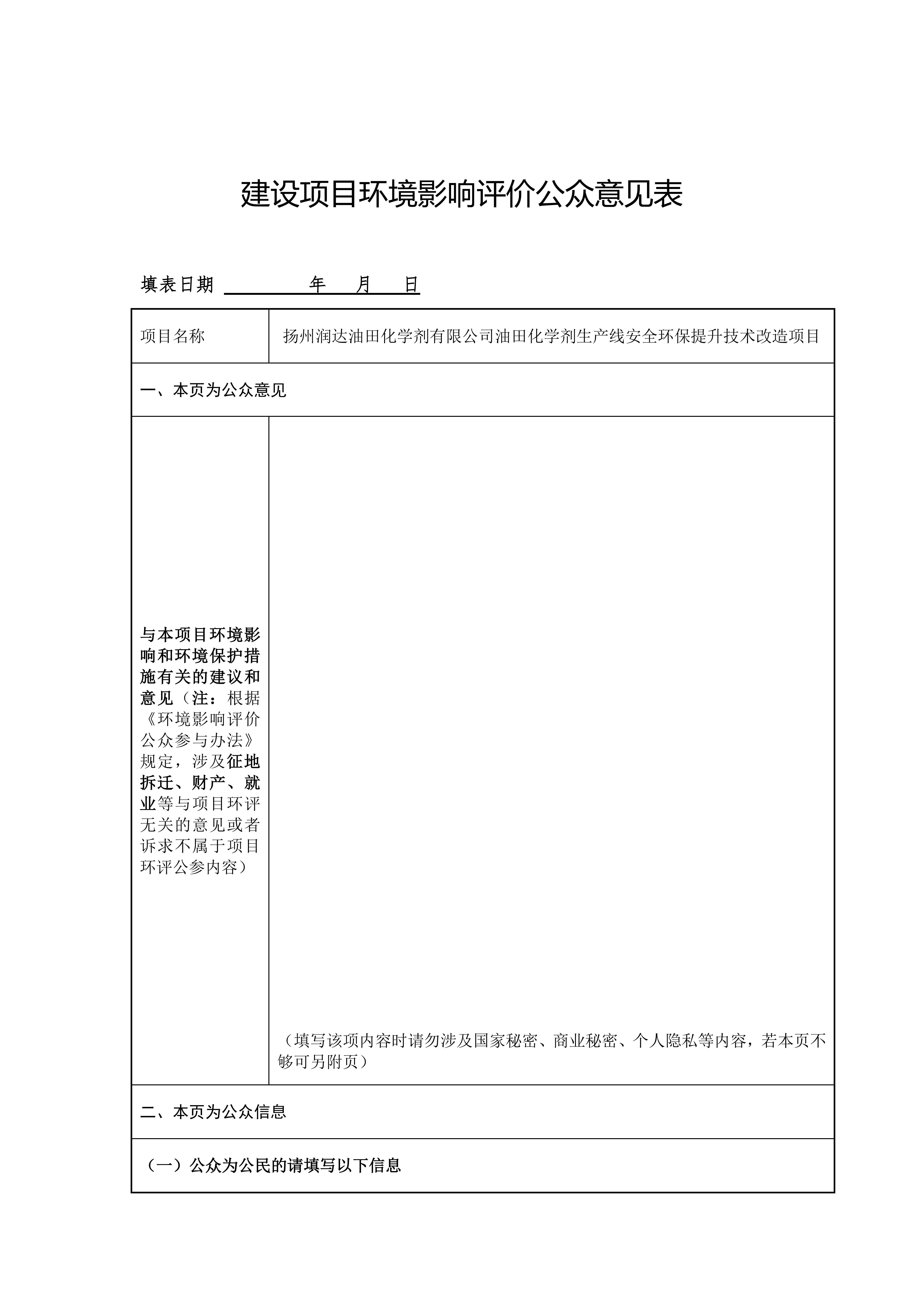 若您对项目有什么意见和看法,可按照附件格式填写建设项目环境影响评价公众参与意见表,请填写与本项目环境影响和环境保护措施有关的建议和意见(注:根据《环境影响评价公众参与办法》规定,涉及征地拆迁、财产、就业等与项目环评无关的意见或者诉求不属于项目环评公参内容)。环境影响评价公众参与意见表见附件。